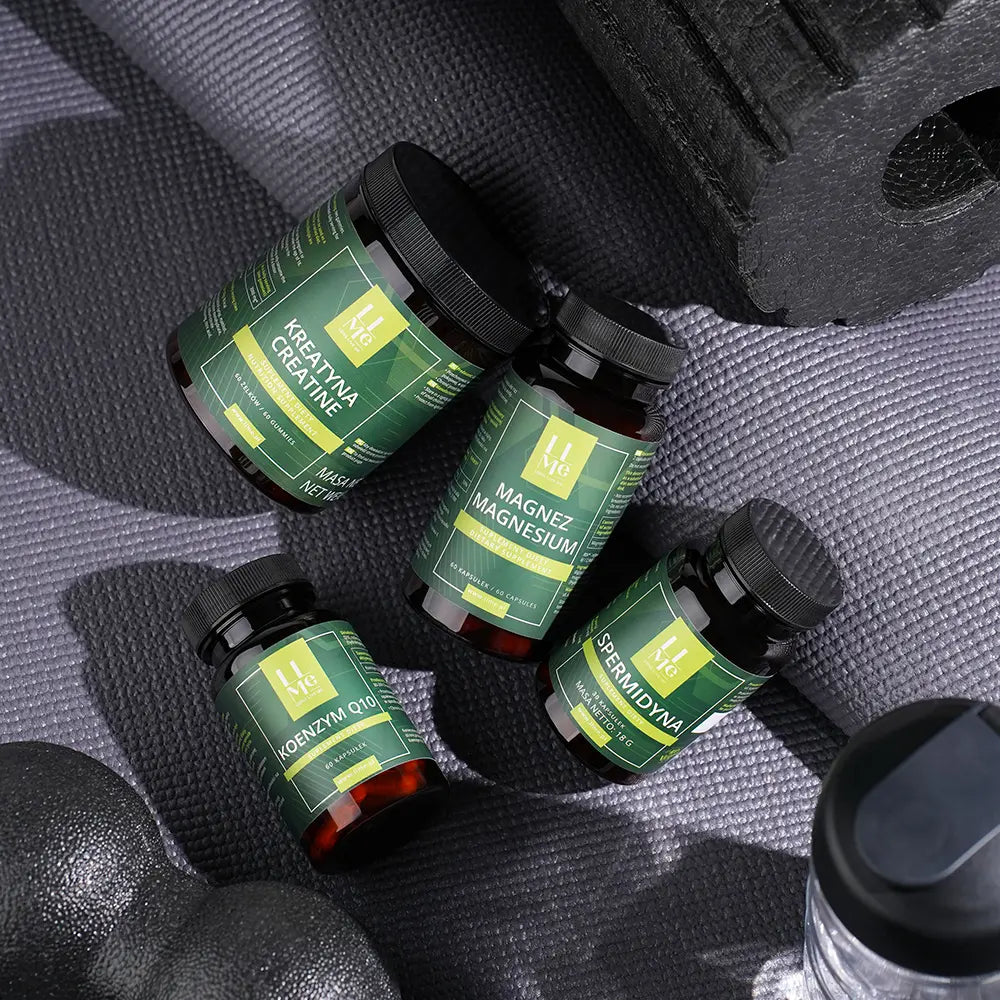 Monohydrat kreatyny, trzy formy magnezu,standaryzowany ekstrakt spermidyny, trans-Q10